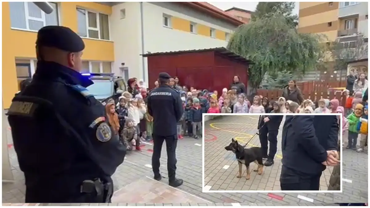VIDEO | Peste 270 de copii din Alba Iulia au descoperit lumea jandarmilor, în cadrul programului educațional „Săptămâna altfel”. Iura, cățelușa instituției, i-a cucerit pe toți