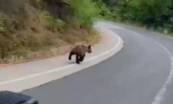 Un pui de urs a fost filmat marți pe drumul dintre Laz și Căpâlna. Animalul fugea speriat pe marginea șoselei.