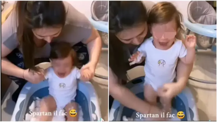 VIDEO VIRAL | Copilaș de câteva luni, cu mâinile şi picioarele goale, băgat de mamă într-o cădiță cu zăpadă pentru a-l ”căli”. Copilul plânge, în timp părinții din jurul său râd: ”Spartan îl fac”